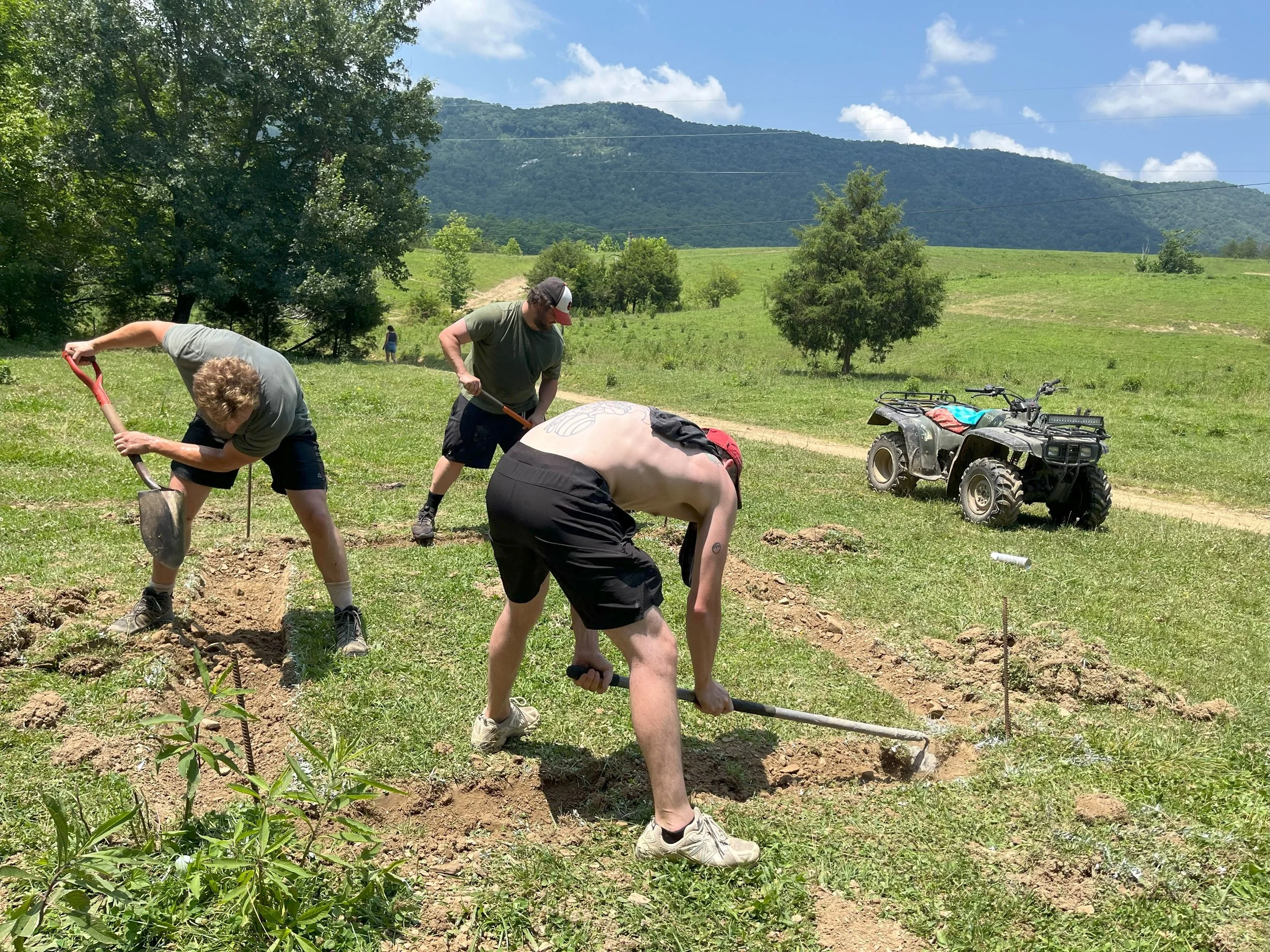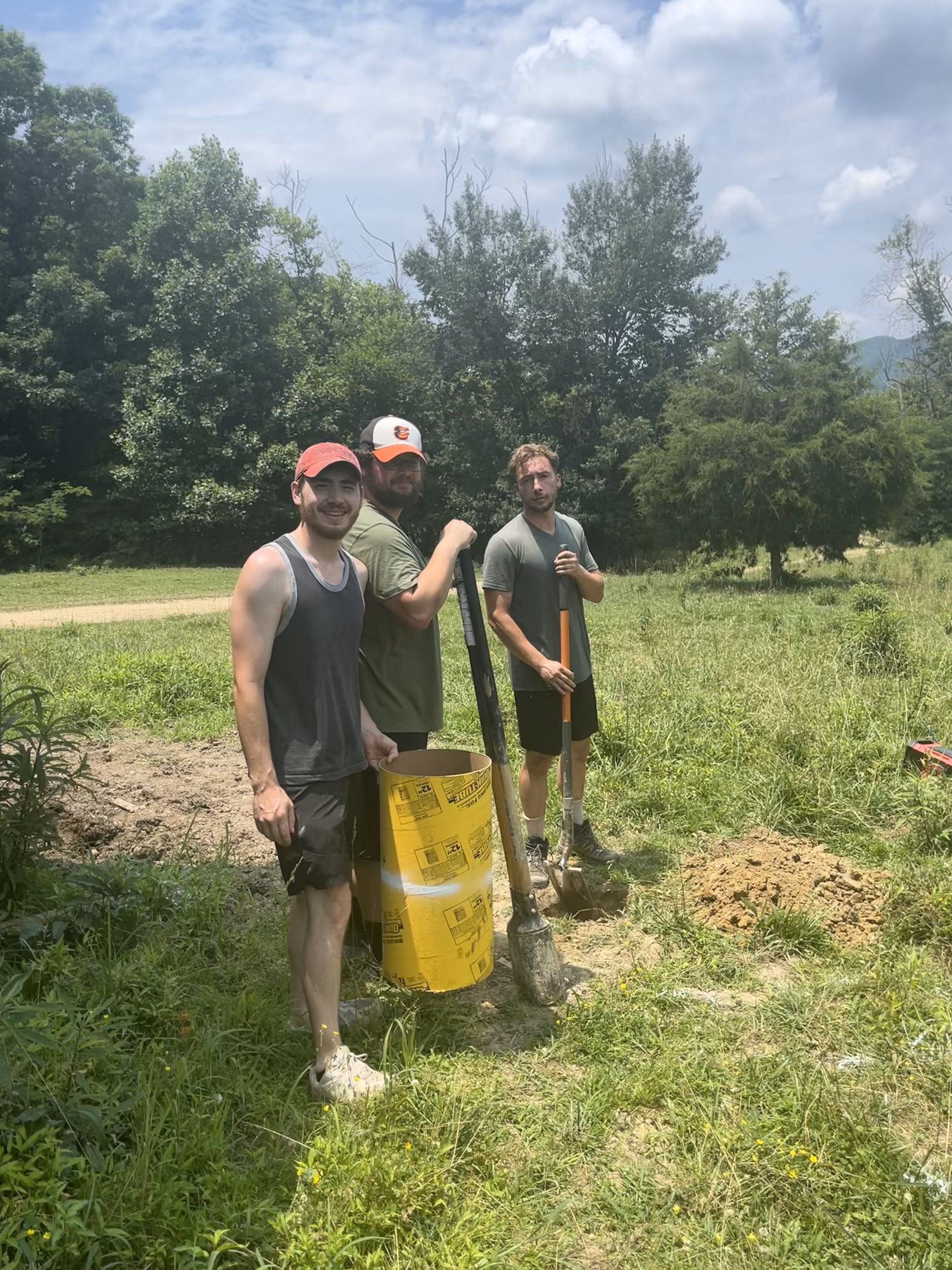 There was a fair amount of work completed over the long weekend amidst all the fun activities. Dave and Taylor installed roof vents, hung drywall, and finished the front porch railing. Ray and Austin ran the cable through the front porch railing. John, Billy, Noah, and Brian helped to dig and pour footers for the run-in we are adding to the barn and for the foundation of the chicken coop.